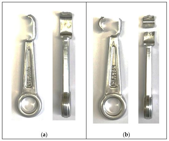 Connecting rods after fatigue breakage: (a) AA-5083-N2-T200, Fmax = 4 kN, 69,696 cycles; (b) AA-5754-N2-T150, Fmax = 3 kN, 219,493 cycles.
