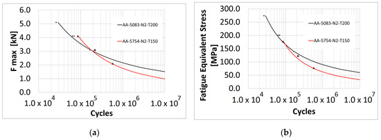 In Figure 10a the influence of the applied load over the number of cycles that is capable of withstanding the connecting rod can be observed. By taking into consideration that the ultimate tension stresses of the aluminium alloys: AA5754-N2-T150, and 5083-N2-T200 are 312 and 485 MPa, respectively, and by using Equation (11), it is possible to obtain Figure 10b which shows both the average equivalent stress and the number of cycles that the connecting rods are capable of withstanding at this equivalent stress.