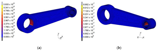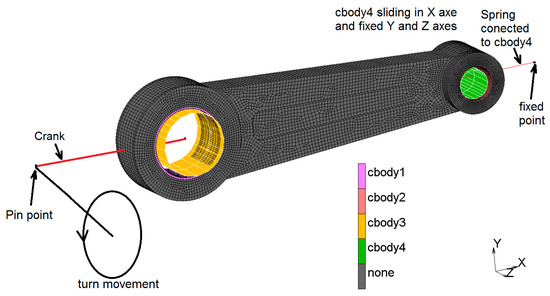 From the FEM simulations it is possible to compare experimental results with those obtained from the simulation. In order to perform the simulations of the connecting rod a meshing as shown in Figure 5 was employed. A rigid-deformable contact was used where the deformable body corresponds to the connecting rod as well as to the cylindrical surfaces of the rigid bodies, as Figure 14 shows. In the pin joint with the higher diameter (cbody3) a rotation movement was imposed with a turning radius of 20 mm, because it is linked to the rotatory disk and it constitutes the crank of the mechanism.