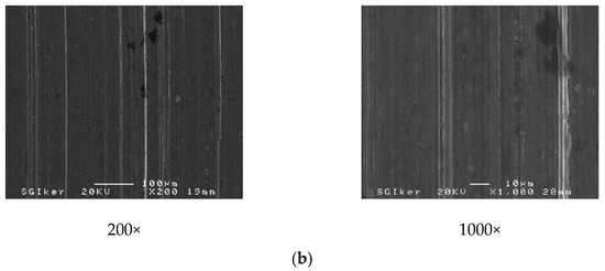 Previous to the SEM analysis, all the samples were cleaned with acetone in order to remove lubricant stains from the wear test. A scanning electron microscope JEOL 6400 (JEOL, Tokyo, Japan) was used and its most important working parameters are as follows: acceleration voltage of 20 kV and beam current of around 0.1 nA.