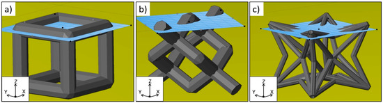 Schematic view of the unit cells of the three lattices studied (as specified in the original CAD design used for manufacture): (a) Cubic; (b) diamond-like and (c) re-entrant cube. An intersecting plane (in the x–y plane) is shown to highlight the changing angle of the trusses to the powder bed. (CAD: Computer aided design.)