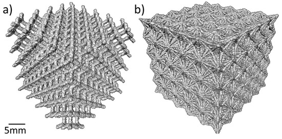 Examples of reconstructed CT volumes of (a) diamond-like and (b) re-entrant cube lattice structures. (CT: X-ray computed tomography.)
