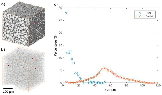 CT-scan of a volume of gas atomised pre-alloyed powder: (a) Reconstructed volume showing the powder particles; (b) internal particle pores highlighted over the powder image; (c) particle and pore size distribution found in gas atomised particles.