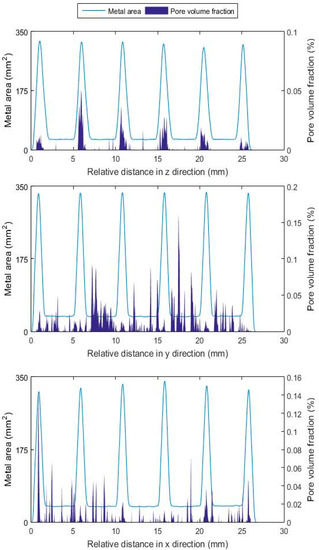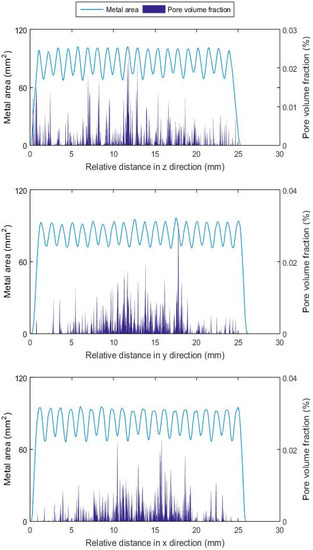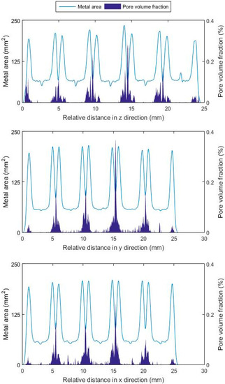 where ϕi is the fraction of the ith constituent, Vi is the respective phase fraction and ΣjVj is the sum of all constituents of the mix, i.e., pore and metal volume. Additionally, the plotted metal area pertains to the voxel area per slice. In the notation used throughout this work, the build direction (normal to the plane of the layers) and the z direction (normal to plane x–y) are parallel.