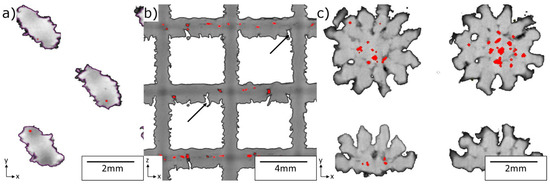 Sections of the reconstructed lattice volumes showing the metal and pore in red: (a) Diamond-like lattice in the z direction at 12.3 mm, see Figure 4; (b) nodes between horizontal and vertical trusses for the Cubic lattice in the x–z plane showing tunnel-like pores highlighted by arrows in black and (c) nodes of the re-entrant lattice in z direction at 9.6 mm showing pore “colonies”.