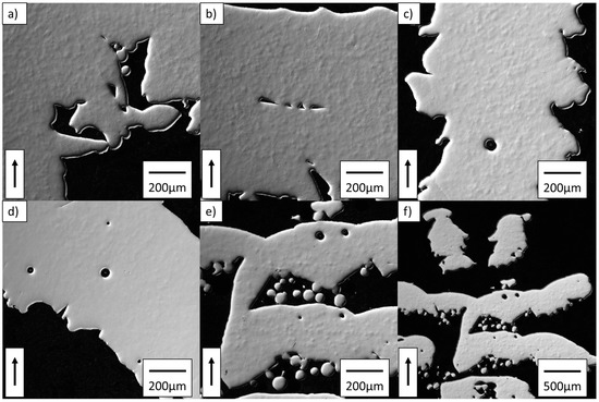 Optical micrographs showing example pores as found in the three CT-scanned lattices. The build direction is indicated by the arrow. (a–c) show defects in cubic lattices; at the beginning of the horizontal truss, elongated pores in horizontal trusses and round pores in vertical trusses, respectively; (d) shows round pores only in diamond-like lattices; (e) pores in trusses from trapped particles in the middle of the nodes of the re-entrant cube; (f) shows a zoom out on the same area.