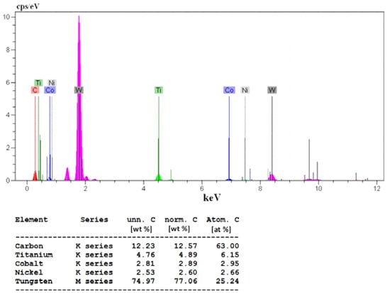 - The results of the EDS analysis indicate that with increasing spark energy, the amount of Tungsten in the surface increases and then decreases. At first, a small amount of Tungsten (17.3 wt %) can be seen on the surface. As spark energy increases, the amount of Tungsten in the surface increases to 41.95 wt %. At higher spark energy, the amount of Tungsten in the surface is reduced.