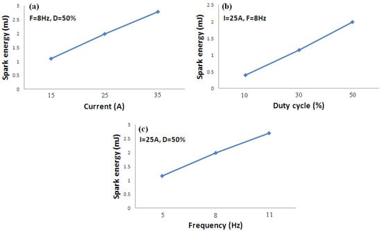 - With increasing current limit, frequency and duty cycle of the process, spark energy increases.