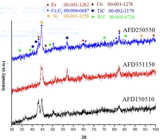 - Obtained peaks of XRD analysis confirmed that in addition to metallic Iron phase with BCC structure, peaks related to phases Tungsten Carbide, Cr7C3 and Titanium Carbide also can be observed.