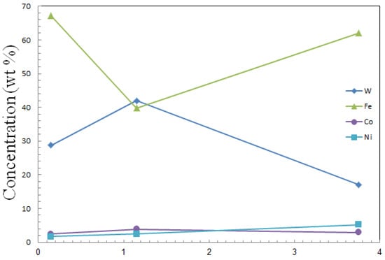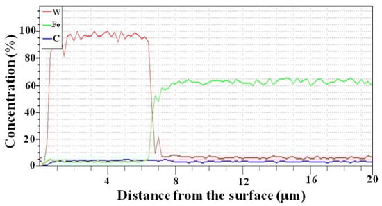 - SEM observations demonstrate that concentrations of Tungsten and Iron are at a maximum limit up to an approximate distance of 6 μm from the surface, but at a distance of 6–8 μm from the surface Iron concentration has increased progressively.
