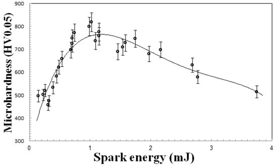 - Surface hardness increases to 817.33 HV0.05 with spark energy increasing up to 1.03 mJ, and then reducing.