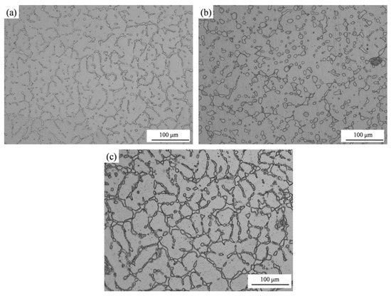 OM (Optical microscopy) micrographs of the three NiTi-based SMAs: (a) Ni45Ti51.8Fe3.2; (b) Ni44Ti51.8Fe3.2Nb1; (c) Ni44Ti51.8Fe3.2Ta1.