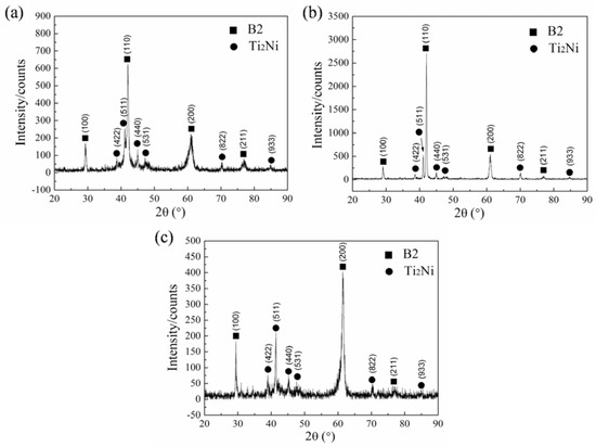 To further determine the phase composition of the three NiTi-based SMAs, XRD maps of Ni45Ti51.8Fe3.2, Ni44Ti51.8Fe3.2Nb1, and Ni44Ti51.8Fe3.2Ta1 SMAs are illustrated in Figure 2. It is evident that the three NiTi-based SMAs are composed of B2 austenite and Ti2Ni precipitate.