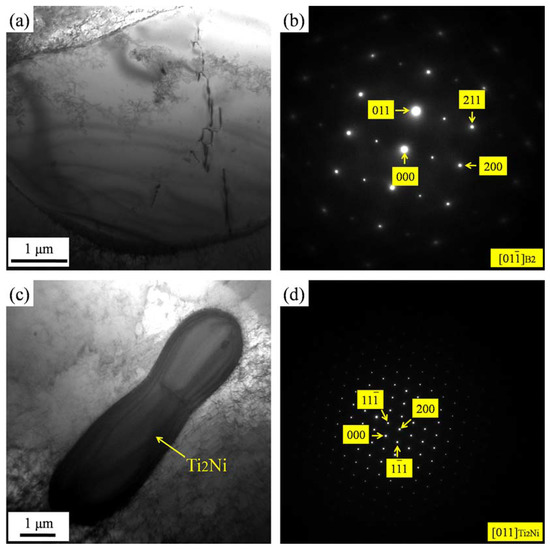 TEM (Transmission electron microscopy) micrographs of Ni45Ti51.8Fe3.2 SMA (Shape memory alloy): (a) Bright field image showing B2 austenite matrix; (b) Diffraction pattern of B2 austenite matrix in (a); (c) Bright field image showing Ti2Ni precipitate; (d) Diffraction pattern of Ti2Ni precipitate in (c).