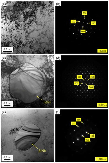 TEM micrographs of Ni44Ti51.8Fe3.2Nb1 SMA: (a) Bright field image showing B2 austenite matrix; (b) Diffraction pattern of B2 austenite matrix in (a); (c) Bright field image showing Ti2Ni precipitate; (d) Diffraction pattern of Ti2Ni precipitate in (c); (e) Bright field image showing β-Nb precipitate; (f) Diffraction pattern of β-Nb precipitate in (e).