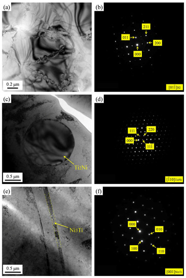 TEM micrographs of Ni44Ti51.8Fe3.2Ta1 SMA: (a) Bright field image showing B2 austenite matrix; (b) Diffraction pattern of B2 austenite matrix in (a); (c) Bright field image showing Ti2Ni precipitate; (d) Diffraction pattern of Ti2Ni precipitate in (c); (e) Bright field image showing Ni3Ti precipitate; (f) Diffraction pattern of Ni3Ti precipitate in (e).
