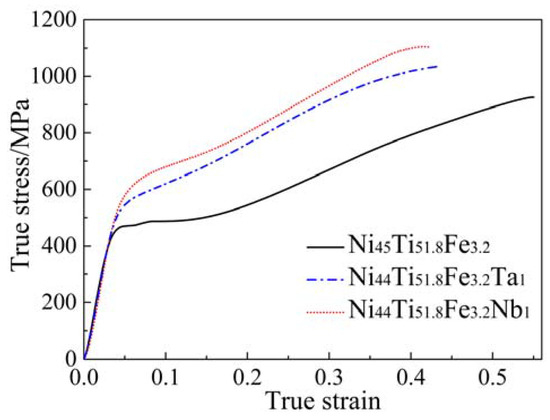 Figure 6 illustrates the stress-strain curves of Ni45Ti51.8Fe3.2, Ni44Ti51.8Fe3.2Nb1, and Ni44Ti51.8Fe3.2Ta1 SMAs under uniaxial compression. It is observed that the addition of Nb and Ta elements results in the increasing yield strength of NiTi-based SMAs, but also leads to the decreasing plasticity of NiTi-based SMAs. Furthermore, Ni44Ti51.8Fe3.2Nb1 SMA possesses a higher yield strength than Ni44Ti51.8Fe3.2Ta1 SMA. In other words, the Nb element plays a more substantial role in strengthening NiTi-based SMAs compared with the Ta element. According to the aforementioned microstructural analysis, no metallic compounds of Nb and Ta elements are observed in the case of Ni44Ti51.8Fe3.2Nb1 and Ni44Ti51.8Fe3.2Ta1 SMAs. Consequently, it can be concluded that Nb and Ta exist in the solid solution of B2 austenite as the solute atoms. In particular, compared to Ni45Ti51.8Fe3.2 and Ni44Ti51.8Fe3.2Nb1 SMAs, Ni44Ti51.8Fe3.2Ta1 SMA exhibits a steady strain hardening ability during plastic deformation. It is well known that the strain hardening ability of metal materials is related closely to the dislocation density. In general, the strain hardening ability increases with increasing dislocation denstiy. Therefore, as for Ni44Ti51.8Fe3.2Ta1 SMA, plenty of dislocations need to be enhanced so as to guarantee the compatiblity of plastic deformation.