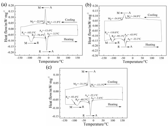 Differential scanning calorimetry (DSC) was used to determine the phase transformation temperatures of the three heat-treated NiTi-based SMA specimens by using a Pyris Diamond type differential scanning calorimeter (Perkin Elmer Inc., Waltham, MA, USA). Therein, DSC measurement temperature ranged from −150 °C to 150 °C, and the heating and cooling rates were determined as 10 °C/min.