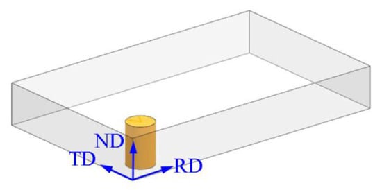 Schematic diagram of specimens cutting from the as-rolled Ti-55 sheet (ND: Normal Direction; RD: Rolling Direction; TD: Transverse Direction).