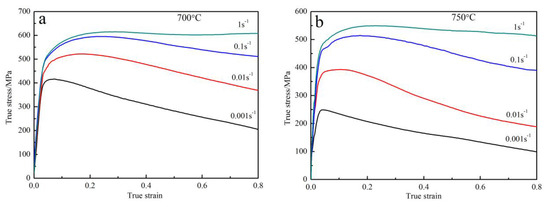 Figure 2 shows the stress-strain curves of as-rolled Ti-55 alloy during isothermal compression at different temperatures and strain rates. Clearly, the flow stress increased with the increase of true strain at the initial deformation stage to the peak stress because of work hardening, and then the flow stress decreased with further increase of true strain due to flow softening occurring during hot compression. Besides, the flow stress decreased with increasing deformation temperature and decreasing strain rate, indicating the flow stress was sensitive to deformation temperature and strain rate. When deformed at higher temperature and lower strain rate (≥900 °C and ≤0.01 s−1), the flow stress-strain curves reached to steady values with the increase of true strain, indicating the softening mechanism, including dynamic recrystallization (DRX) of α phase or dynamic recovery (DRV) of β phase, proceeded quickly to balance the rate of work hardening [9,10]. Besides this, the other secondary phase particles rich in Sn, Mo, Ta and Nb elements at the grain boundaries may have pinning effect on dislocation motion (see Figure 7a), which partly balanced dynamic softening during hot compression of Ti-55 alloy. However, when deformed in other conditions, such as lower temperature and higher strain rate, the curves exhibited continuous softening behavior after peak stress without the steady-state condition occurring due to insufficient softening behavior.