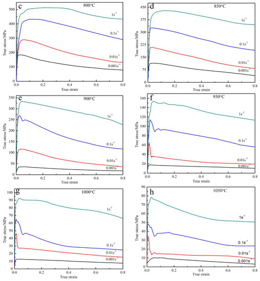Typical stress-strain curves at different temperatures and strain rates of as-rolled Ti-55 alloy: (a) 700 °C; (b) 750 °C; (c) 800 °C; (d) 850 °C; (e) 900 °C; (f) 950 °C; (g) 1000 °C; (h) 1050 °C.