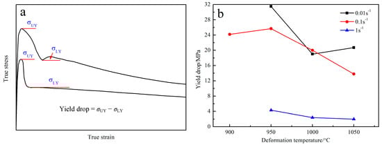 However, the influence of processing parameters, such as deformation temperature and strain rate, on the discontinuous yielding was not clearly understood. For the present titanium alloy, the yield drop appeared most pronouncedly at 950 °C and reduced gradually with further increase of deformation temperature, as shown in Figure 3b. Usually, the increase of deformation temperature may induce two opposite results. On the one hand, the increase of deformation temperature could enhance the thermal activation to promote the generation of new mobile dislocations. On the other hand, the temperature rising may reduce the dislocation density and weaken the stress concentration to restrain the operation of new mobile dislocation. At lower temperature less than 900 °C, the increase of dislocation density and stress concentration could not operate new mobile dislocations significantly due to lower thermal activation and strong pinning effect of high content of alloy elements of Ti-55 alloy. With the increase of deformation temperature in β phase region (>990 °C), the reducing of dislocation density and stress concentration played a main role in restraining the generation of new mobile dislocations, leading to the decrease of the yielding drop.