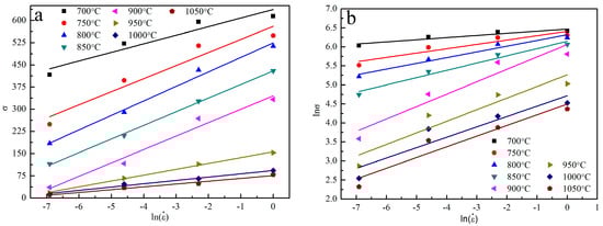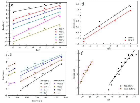 By linear regression of the relations of and at different deformation conditions, the value of α was calculated as 0.00573 and 0.0269 in the temperature range of 700–950 °C and 1000–1050 °C, respectively, as shown in Figure 4a,b. Through linear fitting of vs. and vs. in the temperature ranges of 700–950 °C and 1000–1050 °C shown in Figure 4c–e, the average activation energy Q of as-rolled Ti-55 alloy were calculated to be 453.00 KJ/mol and 279.88 KJ/mol, respectively. Based on the linear relationship of vs. , the stress constant n of as-rolled Ti-55 alloy in the temperature range of 700–950 °C and 1000–1050 °C was calculated as 3.3851 and 2.6125, respectively, as shown in Figure 4f. Besides this, the correlation coefficient of as-rolled Ti-55 alloy in the temperature range of 700–950 °C and 1000–1050 °C for the linear relationship of vs. were 0.9150 and 0.9500, indicating it was reliable to describe the hot deformation behavior of as-rolled Ti-55 alloy by using hyperbolic sine law. Therefore, the dependence of peak stress on the strain rate and deformation temperature of as-rolled Ti-55 alloy in the temperature range of 700–900 °C and 950–1050 °C, respectively, could be expressed as:
