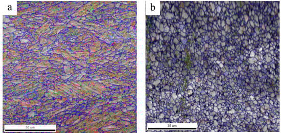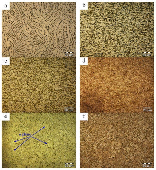When the strain rate increased to 1 s−1 at the temperature of 900 °C, the volume fraction of β-transus microstructure obviously decreased, in which the re-precipitated needle-shaped α phase became finer (see Figure 7d,f). Albeit deformed at higher strain rate, dynamic recrystallization could be observed within the initial α phase due to relatively high deformation temperature, as shown in Figure 7f.