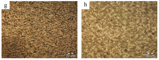 Under the same deformation temperature (900 °C), as the strain rate increased to 0.1 s−1, the elongated α grains could be clearly observed (Figure 5g), indicating less sufficient dynamic recrystallization. When the strain rate decreased to 0.001 s−1, the dynamically recrystallized grains grew slightly and the volume fraction of β-transus microstructure increased since longer deformation time contributed to the coarsening of recrystallized grains as well as more sufficient phase transformation of α to β during hot deformation, as shown in Figure 5h. Hence, both strain rate and deformation temperature exhibited remarkable influence on the microstructure evolution, including dynamic recrystallization and phase transformation of the as-rolled Ti-55 alloy.