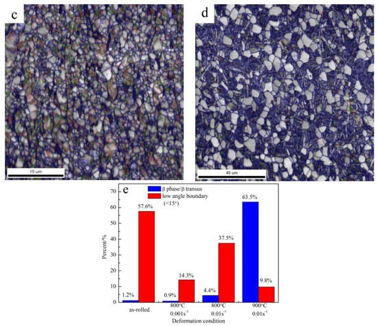 Figure 6 shows the EBSD images of as-rolled sheet and deformed microstructure in different processing conditions. It can be found that recrystallization occurred in the initial elongated microstructure along the grain boundaries, as shown in Figure 6a. But there were a lot of low angle boundaries and small amounts of β phase retained in α phase matrix because of hot rolling deformation at relatively low temperature in the final pass. After hot compression at 800 °C, compared to the initial rolled microstructure, the fraction of low angle boundary reduced obviously and the area fraction of β phase changed slightly because of the relatively low deformation temperature below the β-transus (see Figure 6b,c). As the deformation temperature increased to 900 °C at the strain rate 0.01 s−1, the fraction of low angle boundary continued to reduce, while the area fraction of β-transus microstructure increased significantly due to higher deformation temperature (see Figure 6d). Besides, with the increase of deformation temperature (Figure 6c,d) and the decrease of strain rate (Figure 6b,c), the fraction of low angle boundary decreased and the area fraction of β-transus microstructure increased, as shown in Figure 6e, which was basically consistent with the observation of OM microstructures.