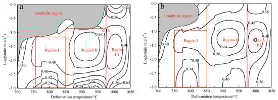 Figure 8b shows the processing maps at the true strain of 0.8 of the as-rolled Ti-55 alloy derived from Murty’s instability criterion. It can be seen that the processing map exhibited three higher power dissipation regions with peak dissipation efficiency of 48–64%: Region I: 750–850 °C/0.001–0.1 s−1, Region II: 850–975 °C/0.001–1 s−1 and Region III: 975–1050 °C/0.001–1 s−1. Although the stacking fault energy of the as-rolled Ti-55 alloy was relatively higher, the softening mechanism of the three steady deformation domains should be DRX because of the relatively higher dissipation efficiency of 48–64% [32]. Besides this, the occurrence of phase transformation also increased the efficiency of power dissipation [33]. Hence, the greater efficiency of power dissipation in Region II and III indicated the occurrence of phase transformation of α to β, which could be verified by the microstructure evolution during hot compression.