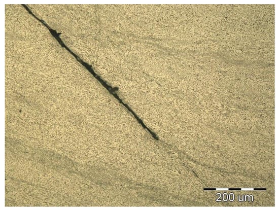 Clearly, the flow instability region predicted by Prasad’s instability criterion was located in the temperature region of 700–975 °C within the strain rate range of 0.1–1 s−1, while the instability region predicted by Murty’s instability criterion was significantly narrower within the temperature range of 700–825 °C and strain rate range of 0.1–1 s−1, as shown in Figure 8. Generally, the mechanism of flow instability should be related to cracking or localized plastic flow [31]. Obviously, shear cracking exhibiting the orientation of ~45° with the compression direction appeared when the specimen was deformed at 700 °C/1 s−1, as shown in Figure 9. In this case, dynamic softening was difficult to take place completely or even operate due to low temperature and short deformation time, which was prone to induce flow instability. However, the microstructure at 900 °C/1 s−1 and 900 °C/0.1 s−1 exhibited partial dynamic recrystallization, restraining flow instability effectively, as shown in Figure 5g and Figure 7f. It indicated that Murty’s criterion was more precise in predicting the flow instability of the as-rolled Ti-55 alloy compared to Parasad’s criterion. Hence, the flow instability region of the as-rolled Ti-55 alloy was located in the temperature range of 700–825 °C and strain rate range of 0.1–1 s−1, and thus the processing map of as-rolled Ti-55 alloy derived from Murty’s criterion was only discussed in the following section, which was thought to have a wider application range for the type of flow stress versus strain rate curves [29,31].