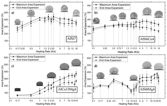 Contrary to the results in the previous cases, the curve for AlSi8Mg4, depicted in Figure 1d, does not assume its minimum at the lowest heating rate, but rather a local minimum at intermediate heating rates at 2–2.5 K/s is observed. This unexpected behavior was confirmed in 10 individual experiments. Nevertheless, the curves of maximum and end area expansion show an increase up to 0.5 K/s, a decrease up to 2 K/s, and a re-increase up to 16 K/s. For heating rates from 2 K/s to 4 K/s the maximum area expansion markedly increases from 143% to 307%, respectively. Similarly high is the difference in the end area expansion which is increased by 137%, whereas the magnitude of collapse remains roughly constant (~13%). A further increase of the heating rate leads to slightly larger expansion values until the highest maximum of 378% at 16 K/s is reached, associated with a stronger collapse (~20%).