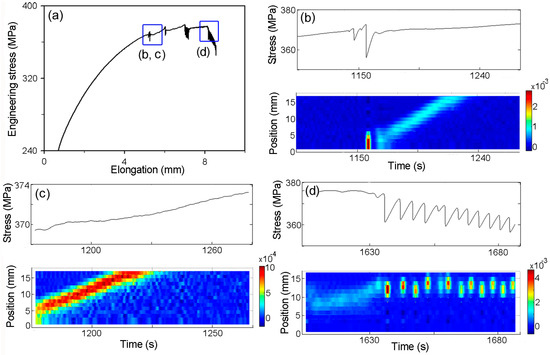 Plastic deformation of Al-based alloys is prone to instability in a wide range of experimental conditions [10]. Binary Al-based alloys, especially 5000 series with Mg as the main impurity, were used for a long time as model materials for investigation of the PLC effect (e.g., [7,8,9,10,11,12,13,14,15,16]). Spatiotemporal behavior of tensile deformation of such alloys fits well the phenomenological classification based on three frequently observed types [2]. In binary Al-Mg alloys, all these types are observed depending on temperature and strain rate. At a given temperature, type A occurs close to the high strain-rate boundary of the domain of instability. It is characterized by deformation bands propagating along the tensile axis. The deformation curves display rises in stress required to nucleate a band. The formation of a band produces a stress drop followed by smoother flow during the band propagation. When the strain rate is reduced, type A is replaced by type B behavior characterized by relatively regular abrupt stress oscillations. They are caused by a brief occurrence of immobile bands in an ordered manner, so that this behavior is referred to as a relay-race or hopping propagation. This pattern provides an additional signature of type B serrations because the passage of a series of bands through the sample corresponds to a packet of regular stress serrations at a similar stress level, followed by an increase in the stress required to start a new relay-race in the work-hardened material. The further decrease in the strain rate leads to less regular and usually very deep and abrupt stress drops of type C associated with almost unordered deformation bands [17].