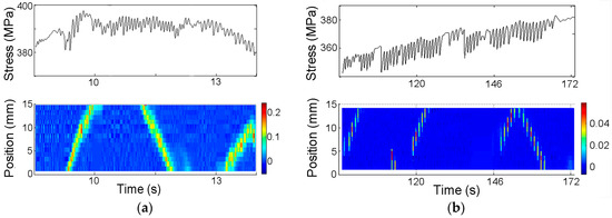 Grain refinement led to qualitative changes in these patterns. Figure 6 represents high strain-rate behavior of the UFG material. As could be anticipated from the deformation curves, type B behavior is preponderant in this case, even if it is difficult to distinguish between quasi-continuous and relay-race propagation at the highest ra = 1.4 × 10−2 s−1 (Figure 6a). The distinct relay race is fully established at 10−3 s−1 in Figure 6b. Moreover, in contrast to the continuous propagation cases in Figure 4 and Figure 5, κ-value exceeds 15 and 50, respectively, at 1.4 × 10−2 and 10−3 s−1.