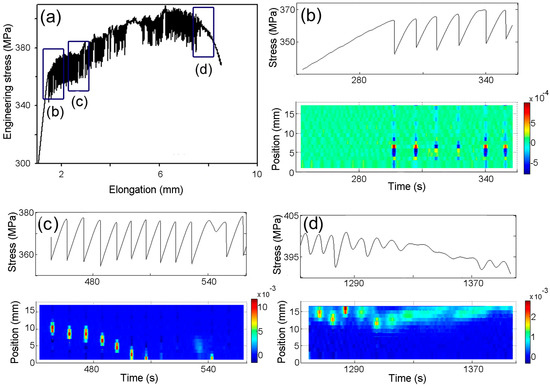 The spatial aspect illustrated in Figure 7 for ra = 1.4 × 10−4 s−1 confirms the suggestion of the starting transition from type B to type C behavior made in Section 3.2. Indeed, Figure 7b displays pairs of deformation bands occurring alternatively between the regions inside and outside the field of vision (Figure 7b manifests rather strong spring-back effect in the region of the elastoplastic transition. It is likely to be due to the fact that the plastic flow has not yet started all over the specimen); the tendency to a relay race (Figure 7c) alternates with uncorrelated nucleation of deformation bands; κ becomes as high as 150; the strain interval close to the onset of necking displays bands hopping forth and back until practically steady strain localization (Figure 7d). On the whole, in contrast to Figure 4 that displays spatiotemporal patterns for CG material at the same strain rate, no continuous band propagation was detected for the UFG material.