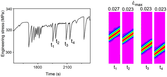 This conclusion is corroborated by the results of DIC imaging at the strain rate of 3 × 10−5 s−1 corresponding to well-established type C serrations represented in Figure 3. Figure 8 displays the initial portion of this deformation curve and four DIC images corresponding to the instants of stress serrations. The vertical rectangles are images of the distribution of the local strain rate almost over the entire gage part of the sample approximately 30 × 7 mm2 in size. The numbers above the rectangles indicate the maximum rloc within each image. It can be seen that the stress drops at the instants t1 to t4 are caused by deformation bands which form an angle about 60° with the tensile axis, characteristic of PLC bands (see, e.g., [12,16]). These bands do not follow a relay race sequence and are characterized by a very high κ between 750 and 900, i.e., more than an order of magnitude higher than the values found for type B bands (cf. Figure 6). The rest of the image appears as a uniform background because the powerful PLC bands dominate the contrast. It should be strengthened that contrarily to CG material, no propagation of PLC bands was found during smooth portions of the deformation curve between stress serrations. These periods thus correspond to an approximately uniform plastic flow. The entire spatiotemporal pattern corresponds to usual type C behavior.