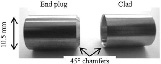 The pieces to be welded are a clad and an end plug. The clad has an outside diameter of 10.5 mm and a thickness equal to 0.5 mm. The end plug has a diameter of 10.5 mm. The contact surfaces are chamfered with an angle of 45°. Figure 1 shows the pieces to be welded: clad and end plug.
