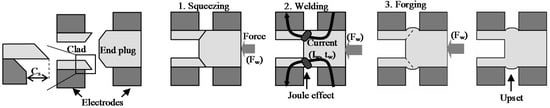 The resistance welding process is composed of three main steps [] represented in Figure 2: the squeezing phase, the welding phase and the forging phase. The two pieces to be welded are circled by two electrodes. The length of the clad that is out of the electrode, called “clad stick-out” (Cs), is considered as a process parameter as demonstrated in a previous paper [] and observed by other authors on other materials [,]. During the squeezing phase, the two pieces to be welded are put and held in contact by a contact force Fw. The next step is the welding phase: a current with an intensity Iw is imposed through the two pieces in contact for a duration tw. The Joule effect generates heat in the materials, especially near the contact surfaces between the two pieces. Then, during the forging phase, the current is stopped and the contact force Fw is upheld until the cooling of the weldment is complete.