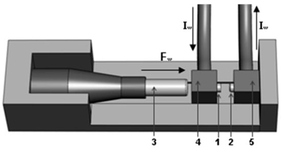 Figure 3. Schematic view of the welding device (Fw = welding force; Iw: welding current intensity; 1: end plug; 2: clad; 3: pneumatic jack; 4 and 5: electrodes).
