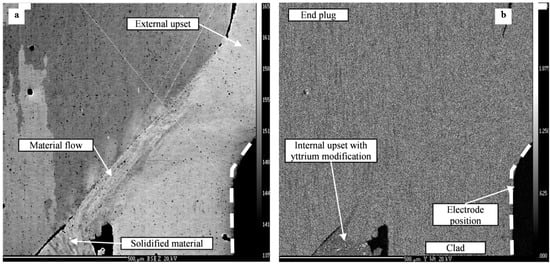 Figure 4 shows a typical weld with good compactness, a continuous interface and no modification of the yttrium distribution except in the internal upset. The modifications in the upsets are supposed to have no importance in the mechanical properties of the weld due to their positions outside the welded joint. The observations in the end plug, “far” from the joint, are representative of the base material due to the low temperature and the negligible deformation reached in this part []. Cavities are due to the fabrication route.