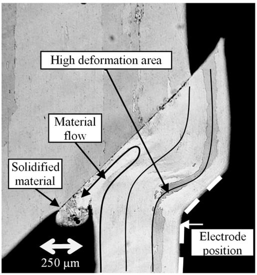 A weld achieved with process parameters leading to a low dissipated energy (370 J) is shown in Figure 7. In the outer part of the weld joint, the faying surfaces are insufficiently joined. This spacing between the faying surfaces will be called a lack of joining in the following.