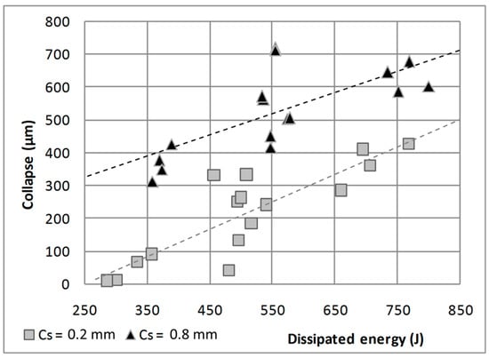 In the internal side, the upset is composed of solidified grains due to expulsed molten materials during welding. Heated materials (below melting temperature) seem to have flown from the clad to the internal upset and are then trapped between the pieces. The deformation of the clad can be monitored by the measurement of the collapse value. The collapse value versus the dissipated energy for 32 experiments within the process parameter range is plotted in Figure 6 for two different clad stick-outs. The collapse (i.e., the deformation) increases when the dissipated energy increases for a given Cs value. A high stick-out-value leads to a higher collapse value. It has to be noted that the collapse can be higher than Cs due to an irregular hand-made chamfer on the electrode (cf. Figure 2).