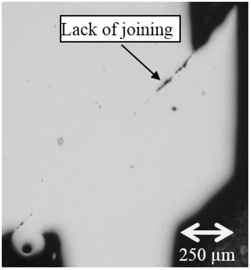 Example of a lack of joining (Mirror polish without etching) for a sample welded with the selected parameters (Fw; Iw; tw; Cs) = (2600 N; 14 kA; 10 ms; 0.8 mm).