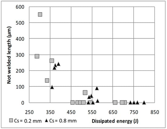 The “not welded length” plotted in Figure 8 as a function of the dissipated energy is the average value of these two measures. It appears that an increase in the dissipated energy leads to a decrease of the not welded length. For a shorter clad stick-out, the dissipated energy required to achieve welds with no lack of joining on both sides is lower (450 J) than the dissipated energy required for a high value of clad stick-out (530 J).