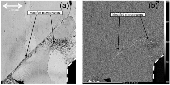 An increase in the modification extent occurs when the collapse increases (Figure 10). The collapse value is highly influenced by the clad stick-out and the dissipated energy (Figure 6). As the collapse increases, the clad deformation increases which combined with a high temperature can trigger the dynamical recrystallization. Modified area localizations observed in Section 3.4 are consistent with the area of high deformation observed in Section 3.2.