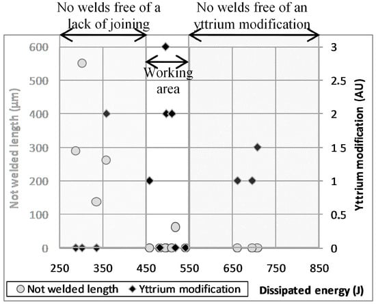 Range of the allowable dissipated energy to achieve welds with no lack of joining and no yttrium modifications (Cs = 0.2 mm).