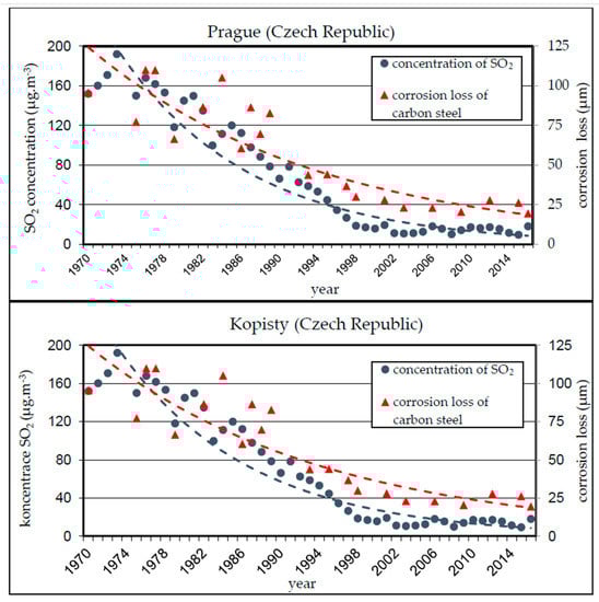 As mentioned above, the most important aggressive corrosion stimulators occurring in the atmosphere include sulphur dioxide (SO2) and chloride ions (Cl−). Sulphur dioxide is brought to the air primarily as a product of fossil fuel combustion. It had the greatest impact on steel corrosion rate in the Czech Republic between 1970 and 1980. The subsequent introduction of desulphurization units brought a substantial reduction of SO2 concentration in the atmosphere and the corrosion losses of carbon steel in the Czech Republic, current values stay below 10 µg/m3 [6,7,8], see Figure 1.