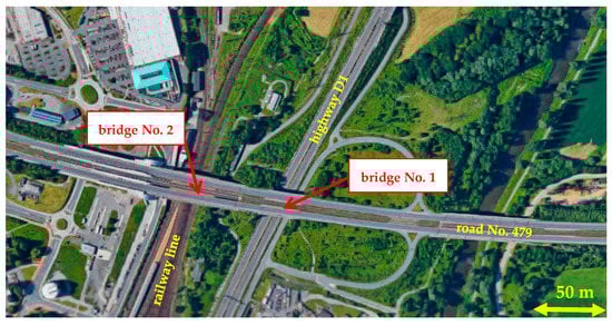 To verify experimentally the influence of road transport under the bridge structure on the amount of chloride deposition and the subsequent development of corrosion products on typical surfaces of bridges designed from weathering steel, two bridge structures located on the same road in Ostrava, Czech Republic (distance from coastal area is about 500 km) were selected (see Figure 2):