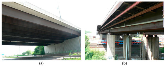 Bridge No. 1 takes the road No. 479 across the busy highway D1. The composite bridge is designed with a reinforced concrete slab and I-shaped main girders. Bridge No. 2 brings the same road across a railway line and is designed with an orthotropic deck and main box girders. Both bridge constructions are designed with Atmofix B [11] weathering steel and are located in Ostrava-Svinov, Czech Republic. The site can be characterized as an urban environment with a degree of atmospheric corrosivity categories C2 to C3 for steel complying with EN ISO 9223 [12]. The distance between the centers of both bridges is approximately 200 m. Figure 3 shows a view of both bridges.